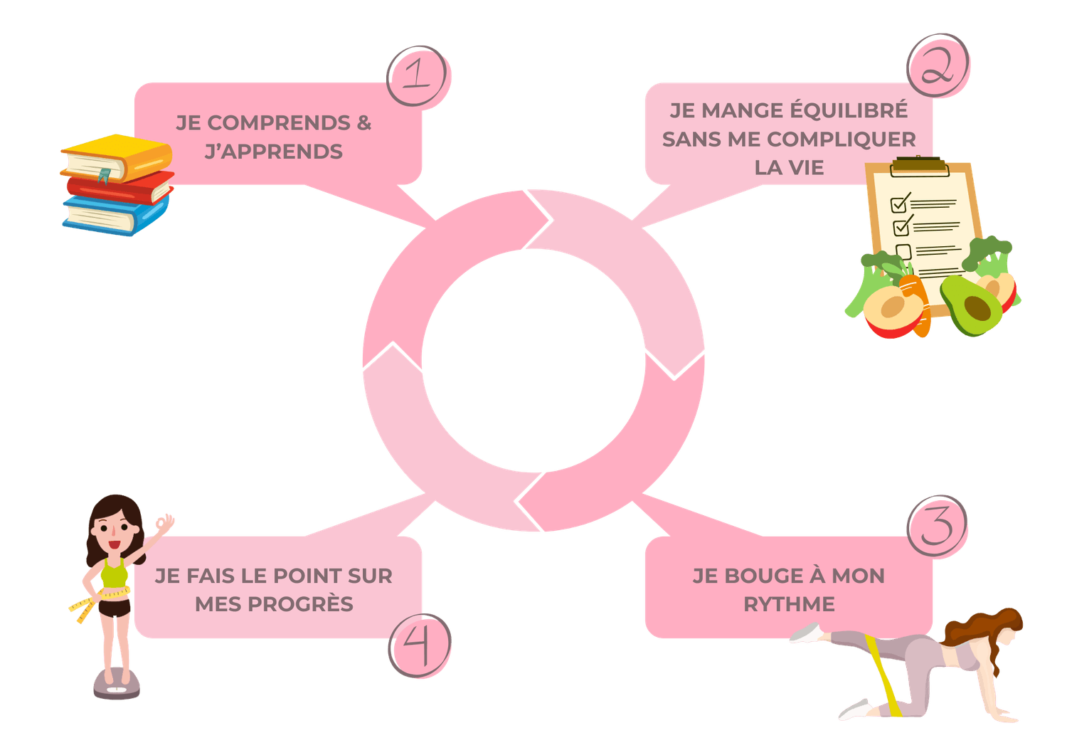 Il s’appuie sur 4 repères essentiels, qui t’accompagnent tout au long de ta progression pour t’aider à construire des habitudes durables et retrouver le contrôle de ton alimentation.
